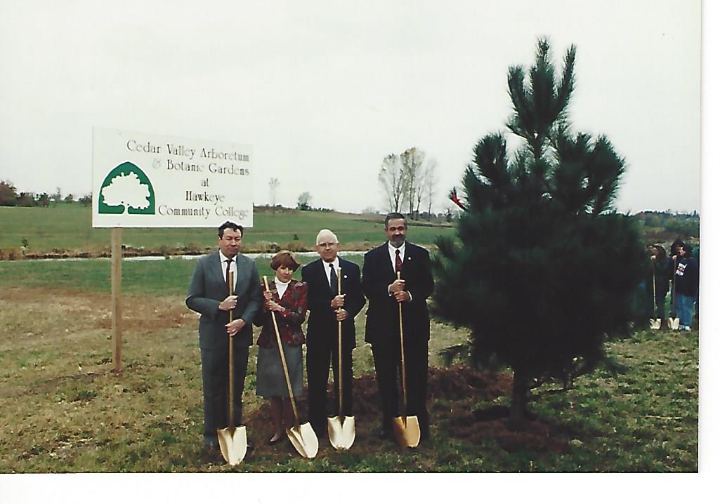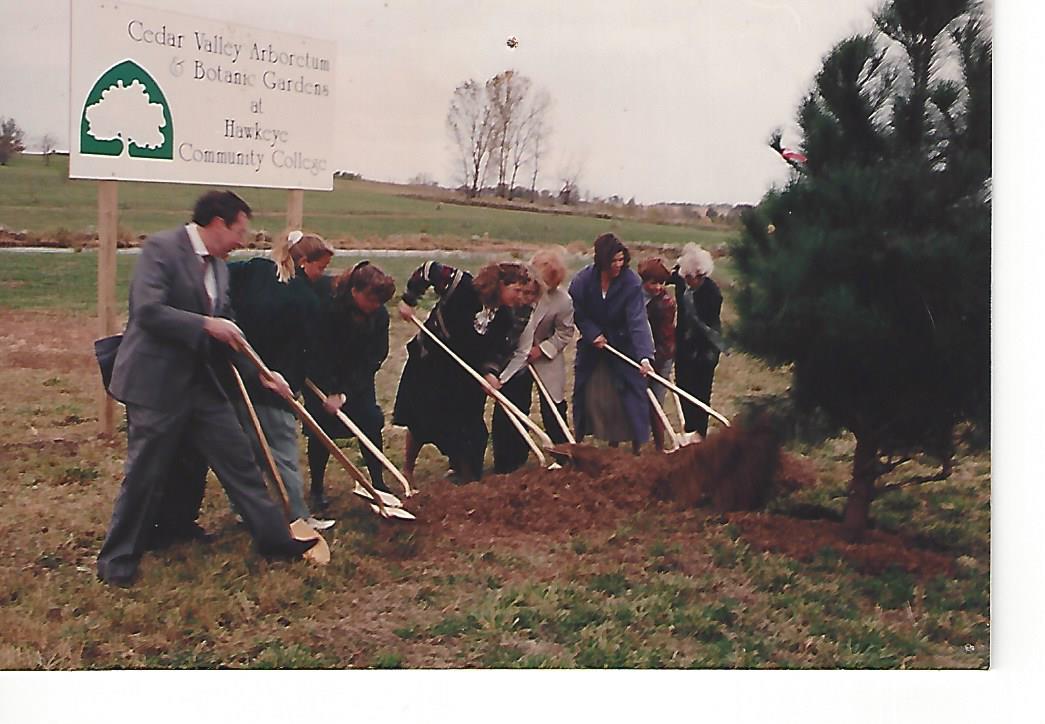 · October of 1995 the official ground-breaking ceremony takes place. Also Dr. Barry president of Hawkeye Community College holds a large luncheon to announce the creation of the Arboretum. Many community leaders attend and a tree donated by Bob Frost is symbolically planted. The only access to the site at this time was from Orange Road via a small entry to the service area for the tower, so this tree was planted in that area.