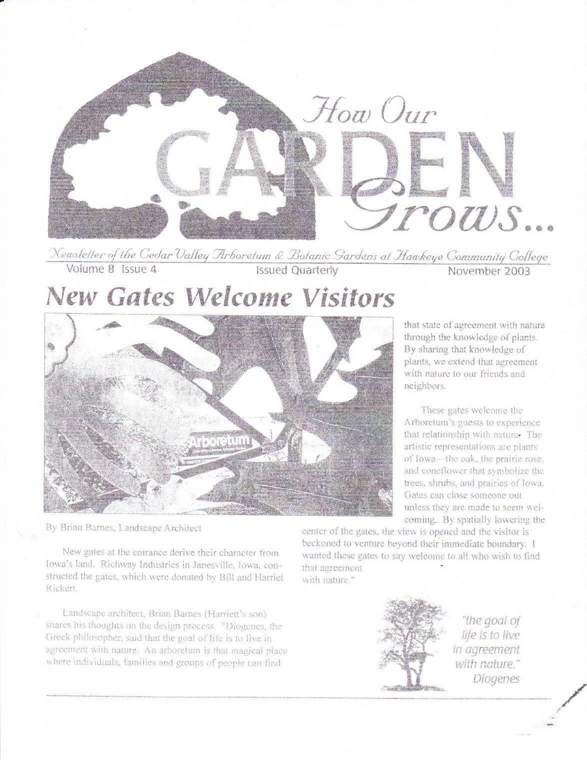 The Arboretum main entrance; now located off Orange Road; is remodeled with $30,000 raised by a committee chaired by Jan Guthrie. A new gate is put in place with funds donated by Bill and Harriet Rickert. This gate is designed by Harriet’s son Brian Barnes a landscape architect in Chicago.