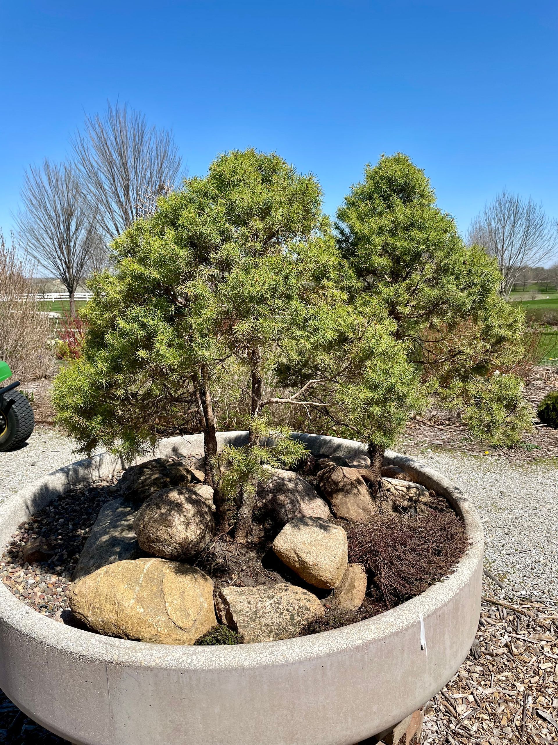 This year's composition is called Lake Shore. My vacation last summer took me kayaking along the Lake Superior shoreline around Copper Harbor and I wanted to bring what I saw into this year's garden design. I started to work on this on my birthday. Naturally, I received a text from my younger sister asking me how the old man was getting along. I sent her a picture of the work I was doing and predictably she replied with “Great you put a pile of rocks in a pot.” This didn’t actually offend me but I felt that I needed to take this to a higher artistic authority. I showed the picture to my wife. I knew exactly what was wrong the second I heard “Oh, but …” I have known her long enough to know what she didn’t like about it. She continued “ The trees aren’t planted straight and is that some dead branches in one of them. Why are the trees so thinly branched?” My reply was “Nature is always beautiful but not always pretty.”