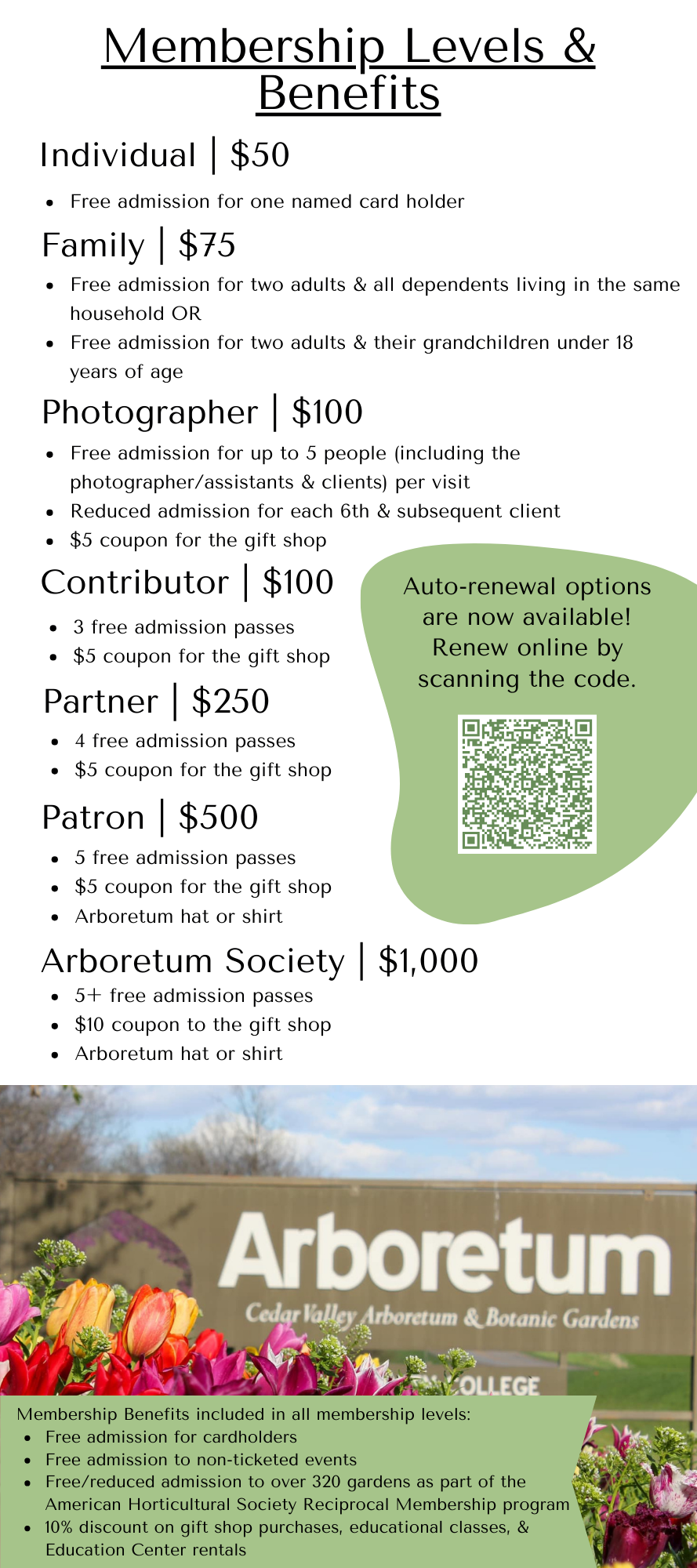Membership to the Cedar Valley Arboretum and Botanic Gardens provides you with lots of fun benefits and access to special events, discounts, and the satisfaction of knowing that your purchase is critical to continuing the growth of the gardens. Use this information to decide which membership is right for you!