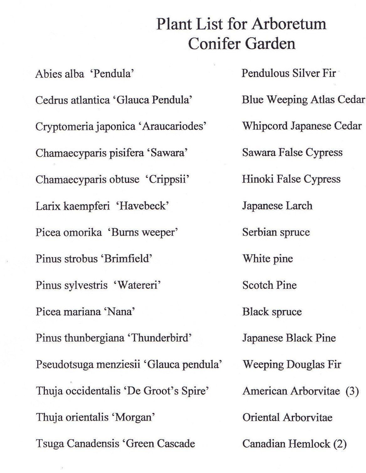 “Conifer Garden developed in part with the Display Garden renovation project. Funds for the original conifers were donated by Green Scene. Conifers were purchased from Hermsens Nursery.”